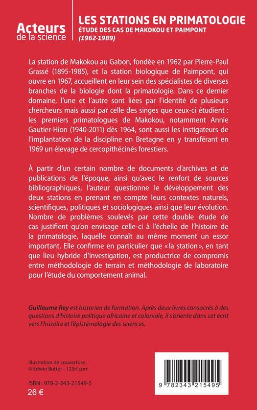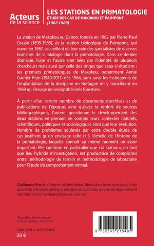 La station de Makokou au Gabon, fondée en 1962 par Pierre-Paul Grassé (1895-1985), et la station biologique de Paimpont, qui ouvre en 1967, accueillent des biologistes, dont des primatologues. Ces stations sont liées par plusieurs chercheurs mais aussi par les singes étudiés: les premiers primatologues de Makokou, notamment Annie Gautier-Hion (1940-2011) dès 1964, sont aussi les instigateurs de l'implantation de la discipline en Bretagne en y transférant en 1969 un élevage de cercopithécinés forestiers. À partir de documents d'archives, l'auteur questionne le développement des deux stations en prenant en compte leurs contextes naturels, scientifiques, politiques et sociologiques ainsi que leur évolution. Nombre de problèmes soulevés par cette étude de cas justifient qu'on envisage celle-ci à l'échelle de l'histoire de la primatologie. Elle confirme en particulier que la station, en tant que lieu hybride d'investigation, est productrice de compromis entre méthodologie de terrain et méthodologie de laboratoire pour l'étude du comportement animal.
