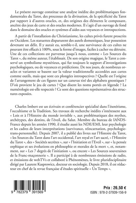 Cet ouvrage de référence vient combler un vide. Il développe nombre de précisions sur les opérations, les symbolismes, l’histoire, la pratique, les bases du Tarot. L’auteur complète d’une manière très documentée, quinze ans après, son livre «L’histoire du Tarot», une étude de fond ayant marqué en 2007. Le présent ouvrage constitue une analyse inédite des problématiques fondamentales du Tarot, des processus de la divination, de la spécificité du Tarot par rapport à d’autres oracles, et, des origines des éléments le composant, ancêtre des jeux de carte et des oracles modernes. Un puits de connaissances, assorti d’exposés sur la divination, la psychologie des tirages et les correspondances symboliques. Il s’agit d’un ouvrage de fond dans le domaine des oracles et systèmes d’aides aux voyances et introspections. Charles Imbert offre une étude complète qui manquait pour analyser le Tarot dans ses parties constitutives (visuelles, numérologiques, légendées, symboliques). Avec le même réalisme que dans les «Sources du Tarot», ouvrage de référence qui, il y a quinze avait été applaudi en révélant l’origine des représentations du Tarot, ce livre est le digne complément d’enquêtes argumentées et les plus exhaustives possibles. Il explique les provenances, raisons, mécanismes et symbolisme du Tarot, duquel ont découlé tous les systèmes modernes de cartes. Les mécanismes des divinations sont abordés, avec l’historique des grands oracles historiques, leurs rapports avec la Renaissance, et la réalité la plus connue des oracles contemporains. Charles Imbert est un écrivain et conférencier spécialisé dans l'ésotérisme, l'occultisme et la Tradition. Ses travaux de recherche inédits s'intéressent aux «Lois et à l'Histoire du monde invisible», aux problématiques des mythes, archétypes, des destins, de l'éveil, du Salut. Membre du bureau de IANDS-France depuis les années 1990, il étudie aussi les NDE/EMI, leur psychologie et les cadres de leurs interprétations (survivance, réincarnation, psychologie-trans-personnelle). Depuis 2007, il a publié des livres sur l’Histoire du Tarot, «les Sources du Tarot dans l’art occidental, l’art royal et l’art sacré», «l'Histoire du Tarot», des «Sociétés secrètes», sur «l'Initiation et l’Eveil», sur «la pensée orphique et ses évolutions en philosophie et morales de la mort», et, notamment, sur «Les 7 degrés de l’initiation», ou encore «Les Sources souveraines de la Franc-maçonnerie». Il a participé à de nombreuses émissions de radio, et émissions de webTVs et collaboré à Phénomènes, le livre pluridisciplinaire dirigé par Laurent Kasprowicz, docteur en sociologie. Depuis 2018, il est rédacteur en chef de la revue française d’études spirituelle «Un Temps». Avec «Les structures du Tarot», aux éditions Code9, il comble donc un vide.