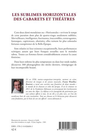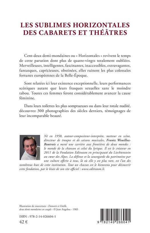 Cent-deux demi-mondaines ou « Horizontales » revivent le temps de cette parution dont plus de quatre-vingts totalement oubliées. Merveilleuses, intelligentes, fascinantes, inaccessibles, extravagantes, fantasques, capricieuses, obstinées, elles ruinent les plus colossales fortunes européennes de la Belle-Époque. Sont relatées ici leur existence exceptionnelle, leurs performances scéniques autant que leurs frasques sexuelles sans le moindre tabou. Toutes ces femmes feront considérablement avancer la cause féminine. Dans leurs toilettes les plus somptueuses ou dans leur totale nudité, découvrez 300 photographies des siècles derniers, témoignages de leur incomparable beauté.