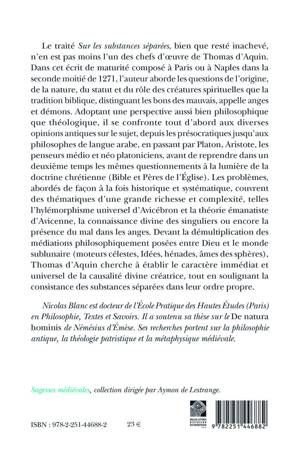 Le traité Sur les substances séparées, bien que resté inachevé, n’en est pas moins l’un des chefs d’œuvre de Thomas d’Aquin. Dans cet écrit de maturité composé à Paris ou à Naples dans la seconde moitié de 1271, l’auteur aborde les questions de l’origine, de la nature, du statut et du rôle des créatures spirituelles que la tradition biblique, distinguant les bons des mauvais, appelle anges et démons. Adoptant une perspective aussi bien philosophique que théologique, il se confronte tout d’abord aux diverses opinions antiques sur le sujet, depuis les présocratiques jusqu’aux philosophes de langue arabe, en passant par Platon, Aristote, les penseurs médio et néo platoniciens, avant de reprendre dans un deuxième temps les mêmes questionnements à la lumière de la doctrine chrétienne (Bible et Pères de l’Église). Les problèmes, abordés de façon à la fois historique et systématique, couvrent des thématiques d’une grande richesse et complexité, telles l’hylémorphisme universel d’Avicébron et la théorie émanatiste d’Avicenne, la connaissance divine des singuliers ou encore la présence du mal dans les anges. Devant la démultiplication des médiations philosophiquement posées entre Dieu et le monde sublunaire (moteurs célestes, Idées, hénades, âmes des sphères), Thomas d’Aquin cherche à établir le caractère immédiat et universel de la causalité divine créatrice, tout en soulignant la consistance des substances séparées dans leur ordre propre.