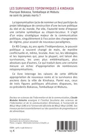 La toponymisation (acte de nommer un lieu) participe du projet idéologique de construction d'une lecture politique du réel et du monde. Par elle, l'autorité tente d'imposer une certaine symbolique au citoyen-locuteur. Il s'agit d'un enjeu stratégique majeur de la communication politique, singulièrement à l'occasion des changements de régime, pour asseoir de nouveaux paradigmes. En RD Congo, 65 ans après l'indépendance, le pouvoir politique a souvent changé de main, de manière conflictuelle et, même, brutale. Avec lui, les idéologies et les toponymes qui, pour la plupart, ont laissé des survivances, les unes plus emblématiques, plus absolues que d'autres. Ce qui traduit dans une certaine mesure un échec d'appropriation de nombreuses retoponymisations. Ce livre interroge les raisons de cette difficile appropriation de nouveaux noms et la survivance des anciens dans la ville de Kinshasa. Parmi eux, ceux de trois figures politiques africaines disparues, les ex-présidents Bokassa, Tombalbaye et Mobutu.
