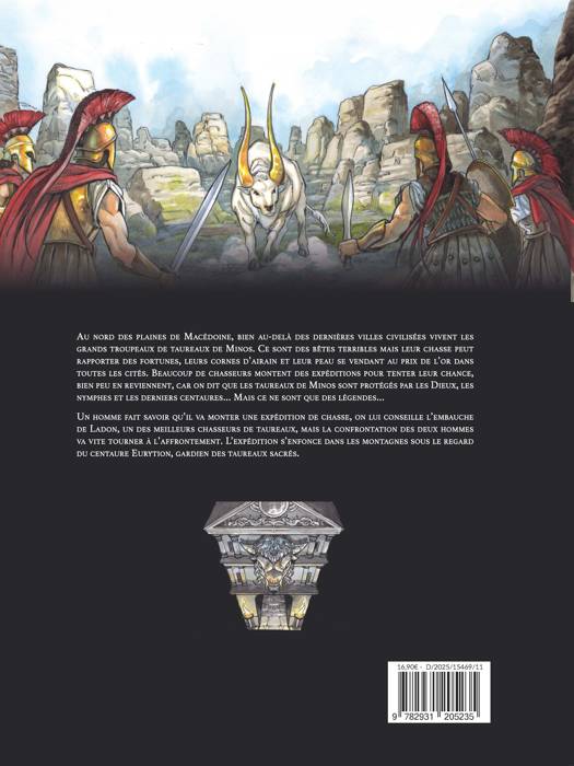 Au nord des plaines de Macédoine, bien au-delà des dernières villes civilisées vivent les grands troupeaux de taureaux de Minos. Ce sont des bêtes terribles mais leur chasse peut rapporter des fortunes, leurs cornes d'airain et leur peau se vendant au prix de l'or dans toutes les cités. Beaucoup de chasseurs montent des expéditions pour tenter leur chance, bien peu en reviennent, car on dit que les taureaux de Minos sont protégés par les Dieux, les nymphes et les derniers centaures⦠Mais ce ne sont que des légendes⦠Un homme fait savoir qu'il va monter une expédition de chasse, on lui conseille l'embauche de Ladon, un des meilleurs chasseurs de taureaux, mais la confrontation des deux hommes va vite tourner à l'affrontement. L'expédition s'enfonce dans les montagnes sous le regard du centaure Eurytion, gardien des taureaux sacrés.
