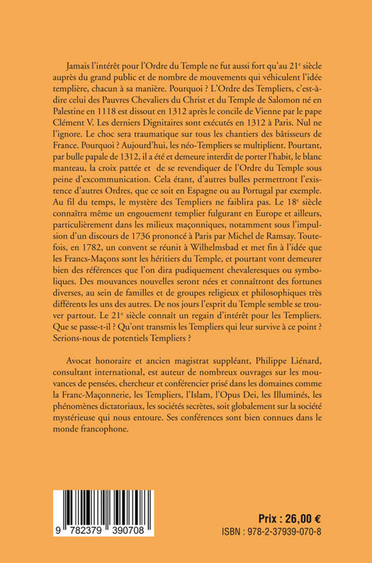 L'auteur spécialiste des Templiers a examiné les origines du Temple avant 1118, son expansion, son originalité, sa dissolution, sa dispersion. Il se penche avec force références de recherches sur les mystérieuses suites spirituelles. Cet ouvrage met donc le focus sur le phénomène templier qui, après son apogée et une éclipse relative, a connu une sorte de renaissance depuis le 18e siècle et connaît un succès d’apparence irrationnelle mais bien réelle en ce 21e siècle. La question est de savoir pourquoi. De manière inédite, le livre se penche donc sur les Ordres qui ont jalonné l’Histoire, de manière contemporaine aux Templiers dont l’Ordre est dissout en 1312 et sur les autres structures et mouvances ultérieurs et actuels. Y aurait-il un esprit templier ? Il existe plusieurs filiations templières. Aujourd’hui, les néo-Templiers se multiplient. Pourtant, par bulle papale de 1312, il a été et demeure interdit de porter l’habit, le blanc manteau, la croix pattée et de se revendiquer de l’Ordre du Temple sous peine d’excommunication. Cela étant, d’autres bulles permettront l’existence d’autres Ordres, que ce soit en Espagne ou au Portugal par exemple. Au fil du temps, le mystère des Templiers ne faiblira pas. Le 18e siècle connaîtra même un engouement templier fulgurant en Europe et ailleurs, particulièrement dans les milieux maçonniques, notamment sous l’impulsion d’un discours de 1736 prononcé à Paris par Michel de Ramsay. Toutefois, en 1782, un convent se réunit à Wilhelmsbad et met fin à l’idée que les Francs-Maçons sont les héritiers du Temple, et pourtant vont demeurer bien des références que l’on dira pudiquement chevaleresques ou symboliques. Des mouvances nouvelles seront nées et connaîtront des fortunes diverses, au sein de familles et de groupes religieux et philosophiques très différents les uns des autres. De nos jours l’esprit du Temple semble se trouver partout. Que se passe-t-il ? L’ouvrage entre dans les détails. Qu’ont transmis les Templiers qui leur survive à ce point ? Au demeurant, serions-nous de potentiels Templiers ? L'intérêt et le succès templiers ne se démentent pas. L'auteur e explique les raisons et examine à la loupe l'évolution depuis 1312 jusqu'à nos jours. Il y a des Templiers modernes sur les deux hémisphères. Lesquels et pourquoi portent-ils et se réfèrent-ils à cet Ordre qui n 'existe officiellement plus ?