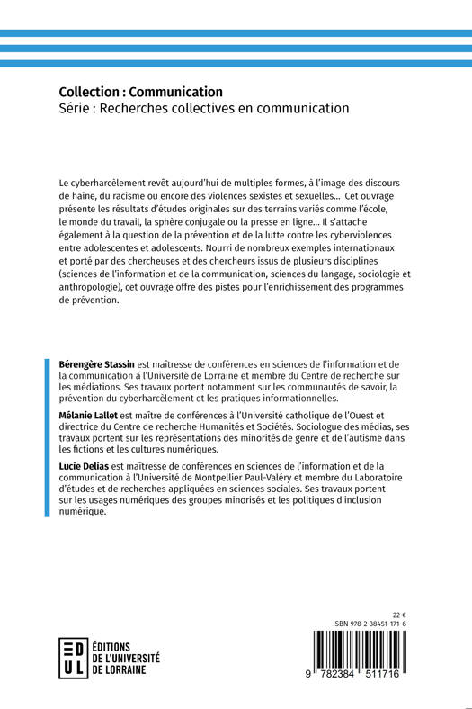Le cyberharcèlement revêt aujourd’hui de multiples formes, à l’image des discours de haine, du racisme ou encore des violences sexistes et sexuelles... Cet ouvrage présente les résultats d’études originales sur des terrains variés comme l’école, le monde du travail, la sphère conjugale ou la presse en ligne… Il s’attache également à la question de la prévention et de la lutte contre les cyberviolences entre adolescentes et adolescents. Nourri de nombreux exemples internationaux et porté par des chercheuses et des chercheurs issus de plusieurs disciplines (sciences de l’information et de la communication, sciences du langage, sociologie et anthropologie), cet ouvrage offre des pistes pour l’enrichissement des programmes de prévention.