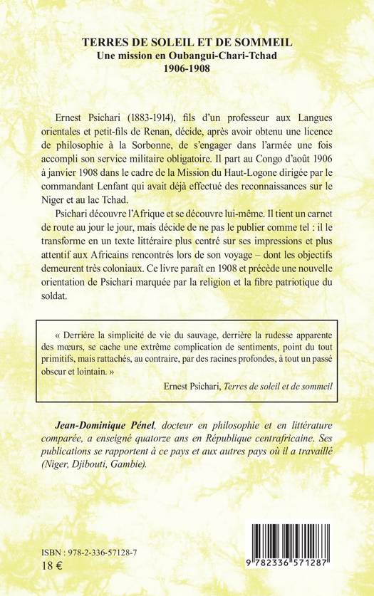 Ernest Psichari (1883-1914), fils d'un professeur aux Langues orientales et petit-fils de Renan, décide, après avoir obtenu une licence de philosophie à la Sorbonne, de s'engager dans l'armée une fois accompli son service militaire obligatoire. Il part au Congo d'août 1906 à janvier 1908 dans le cadre de la Mission du Haut-Logone dirigée par le commandant Lenfant qui avait déjà effectué des reconnaissances sur le Niger et au lac Tchad.