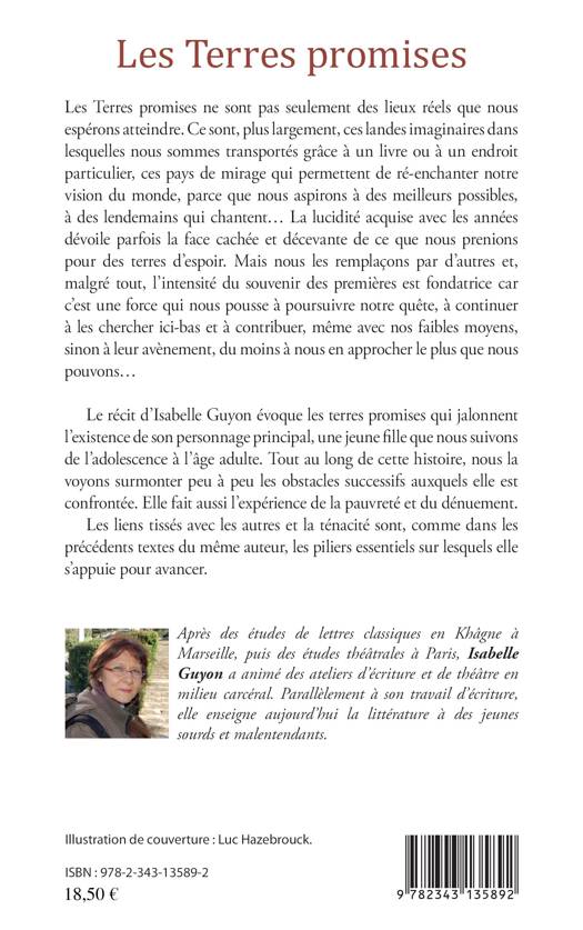 Le récit d'Isabelle Guyon évoque les terres promises qui jalonnent l'existence de son personnage principal, une jeune fille que nous suivons de l'adolescence à l'âge adulte. Tout au long de cette histoire, nous la voyons surmonter peu à peu les obstacles successifs auxquels elle est confrontée. Elle fait aussi l'expérience de la pauvreté et du dénuement. Les liens tissés avec les autres et la ténacité sont, comme dans les précédents textes du même auteur, les piliers essentiels sur lesquels elle s'appuie pour avancer.
