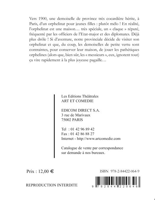 Vers 1900, une demoiselle de province très cocardière hérite, à Paris, d'un orphelinat pour jeunes filles: plutôt mélo ! En réalité, l'orphelinat est une maison... très spéciale, un claque réputé, fréquenté par les officiers de l'Etat-major et des diplomates. Déjà plus drôle ! Si d'aventure, notre provinciale décide de visiter son orphelinat et que, du coup, les demoiselles de petite vertu sont contraintes, pour conserver leur maison, de jouer les pathétiques orphelines (alors que, bien sûr, les messieurs, eux, ignorent tout) ça vire rapidement à la plus joyeuse pagaille...