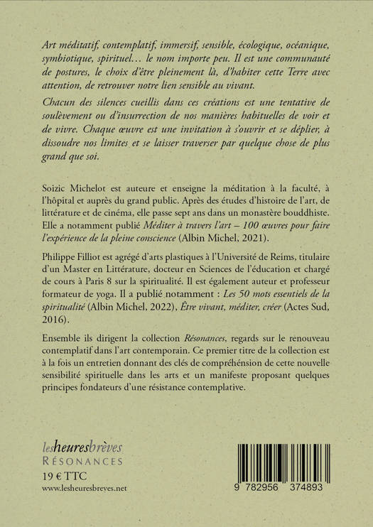 Art immersif, résistance poétique, oeuvres contemplatives, de nouvelles formes d’arts sensibles prennent une importance croissante dans le paysage artistique contemporain. Elles s’inscrivent dans une tendance plus large d’émergence d’une nouvelle conscience, d’un autre rapport au monde, respectant le vivant, réinterprétant des gestes ancestraux. Ces créations portent en elles une résistance contemplative face à un monde de plus en plus matériel, qui impose à chacun de s’oublier pour être plus performant. Ce livre est à la fois un dialogue entre les deux auteurs, donnant des clés de compréhension de cette nouvelle sensibilité spirituelle dans les arts, et un manifeste proposant quelques principes fondateurs d’une résistance contemplative. Le Manifeste permet de mieux cerner l’enjeu de ces oeuvres, leur rôle pour nous aider à imaginer un monde nouveau, leur proposition pour trouver une place dans nos sociétés en mutation, en retrouvant l’espérance par une autre façon d’être humain parmi les vivants. Soizic Michelot est auteure et enseigne la méditation à la faculté, à l’hôpital et auprès du grand public. Après des études d’histoire de l’art, de littérature et de cinéma, elle passe sept ans dans un monastère bouddhiste. Elle a notamment publié Méditer à travers l’art – 100 oeuvres pour faire l’expérience de la pleine conscience (Albin Michel, 2021). Philippe Filliot est agrégé d’arts plastiques à l’Université de Reims, titulaire d’un Master en Littérature, docteur en Sciences de l’éducation et chargé de cours à Paris 8 sur la spiritualité. Il est également auteur et professeur formateur de yoga. Il a publié notamment : Les 50 mots essentiels de la spiritualité (Albin Michel, 2022), Être vivant, méditer, créer (Actes Sud, 2016). Ensemble ils dirigent la collection Résonances, regards sur le renouveau contemplatif dans l’art contemporain. Ce titre est le premier de la collection.
