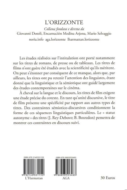 Les études réalisées sur l'intitulation ont porté notamment sur les titres de romans, de presse ou de tableaux. Les titres de films n'ont guère été étudiés avec la scientificité qu'ils méritent. On peut s'étonner par conséquent de ce manque alors que, par ailleurs, les titres ont pu retenir l'attention des linguistes, étant donné que la linguistique et la sémiotique ont guidé largement des études contemporaines sur le cinéma. À cheval sur la langue et le discours, les titres de film exigent une étude précise du cotexte, une approche sémiotico-linguistique. En tant qu'unité discursive, le titre de film présente une spécificité par rapport aux autres types de titres. Des contraintes sémiotico-discursives conditionnent la forme de ces séquences linguistiques particulières. Le « statut autonyme » des titres (J. Rey-Debove; B. Bosredon) pemettra de montrer ces contraintes en discours suivi.