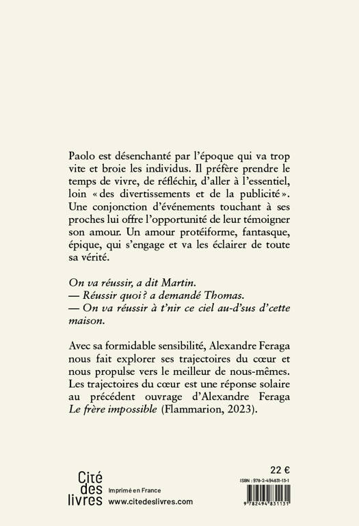 Paolo est désenchanté par l’époque qui va trop vite et broie les individus. Il préfère prendre le temps de vivre, de réfléchir, d’aller à l’essentiel, loin « des divertissements et de la publicité ». Une conjonction d’événements touchant à ses proches lui offre l’opportunité de leur témoigner son amour. Un amour protéiforme, fantasque, épique, qui s’engage et va les éclairer de toute sa vérité. Avec sa formidable sensibilité, Alexandre Feraga nous fait explorer ses trajectoires du coeur et nous propulse vers le meilleur de nous-mêmes. “- On va réussir, a dit Martin. - Réussir quoi ? a demandé Thomas. - On va réussir à t’nir ce ciel au-de’sus d’cette maison.” “Les trajectoires du coeur” est une réponse solaire au précédent ouvrage d’Alexandre Feraga “Le frère impossible” (Flammarion, 2023).