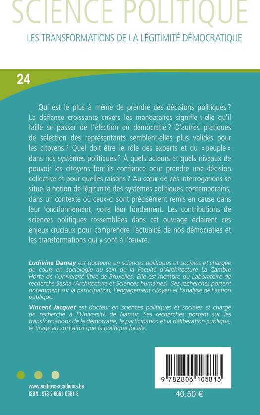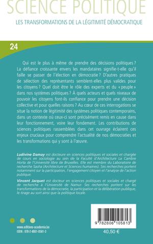 Qui est le plus à même de prendre des décisions politiques ? Quel doit être le rôle des élus, des experts et du peuple en démocratie ? À quels acteurs, processus et niveaux de pouvoir les citoyens font-ils davantage confiance ? Au coeur de ces interrogations se niche le concept de légitimité qui mérite d'autant plus d'être questionné que nos démocraties sont sous tensions. Cet ouvrage collectif de sciences politiques et sociales ambitionne d'aider à comprendre l'actualité de nos démocraties.