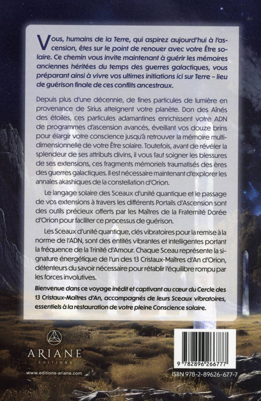 Vous, humains de la Terre, qui aspirez aujourd’hui à l’ascension, êtes sur le point de renouer avec votre Être solaire. Ce chemin vous invite maintenant à guérir les mémoires anciennes héritées du temps des guerres galactiques, vous préparant ainsi à vivre vos ultimes initiations ici sur Terre – lieu de guérison finale de ces conflits ancestraux. Depuis plus d’une décennie, de fines particules de lumière en provenance de Sirius atteignent votre planète. Don des Aînés des étoiles, ces particules adamantines enrichissent votre ADN de programmes d’ascension avancés, éveillant vos douze brins pour élargir votre conscience jusqu’à retrouver la mémoire multidimensionnelle de votre Être solaire. Toutefois, avant de révéler la splendeur de ses attributs divins, il vous faut soigner les blessures de ses extensions, ces fragments mémoriels traumatisés des ères des guerres galactiques. Il est nécessaire maintenant d’explorer les annales akashiques de la constellation d’Orion. Le langage solaire des Sceaux d’unité quantique et le passage de vos extensions à travers les différents Portails d’Ascension sont des outils précieux offerts par les Maîtres de la Fraternité Dorée d’Orion pour faciliter ce processus de guérison. Les Sceaux d’unité quantique, clés vibratoires pour la remise à la norme de l’ADN, sont des entités vibrantes et intelligentes portant la fréquence de la Trinité d’Amour. Chaque Sceau représente la signature énergétique de l’un des 13 Cristaux-Maîtres d’An d’Orion, détenteurs du savoir nécessaire pour rétablir l’équilibre rompu par les forces involutives. Bienvenue dans ce voyage inédit et captivant au coeur du Cercle des 13 Cristaux-Maîtres d’An, accompagnés de leurs sceaux vibratoires, essentiels à la restauration de votre pleine Conscience solaire.