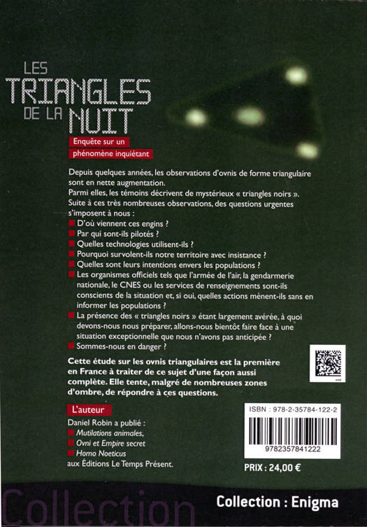 Depuis quelques années, les observations d’Ovnis de forme triangulaire sont en nette augmentation. Parmi elles, les témoins décrivent de mystérieux « triangles noirs ». Suite à ces très nombreuses observations, des questions urgentes s’imposent à nous : d’où viennent ces engins ? Par qui sont-ils pilotés ? Quelles technologies utilisent-ils ? Pourquoi survolent-ils notre territoire avec insistance ? Quelles sont leurs intentions envers les populations ? Cette sorte de « surveillance » permanente obéit-elle à un plan, et si oui, lequel ? Les organismes officiels tels que l’armée de l’air, la gendarmerie nationale, le CNES, les services de renseignements, sont-ils conscients de la situation et, si oui, quelles actions mènent-ils sans en informer les populations ? Dans le cas où ces organismes officiels mèneraient des actions soutenues visant à surveiller les activités des Ovnis, pourquoi ces actions sont-elles gardées secrètes ? Quelle est l’étendue des connaissances de ces organismes au sujet des Ovnis ? La présence des « triangles noirs » étant largement avérée, à quoi devons-nous nous préparer ? Allons-nous bientôt faire face à une situation exceptionnelle que nous n’avons pas anticipée ? Sommes-nous en danger ? Cette étude sur les Ovnis triangulaires, qui est la première en France à traiter de ce sujet d’une façon aussi complète, tente, malgré de nombreuses zones d’ombre, de répondre à ces questions.