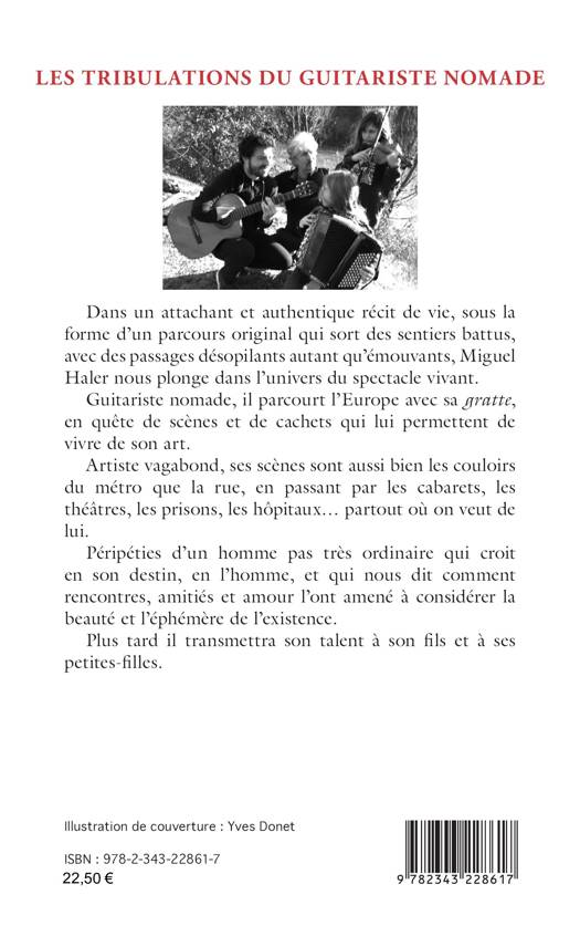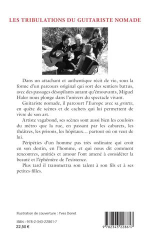 Dans un attachant et authentique récit de vie, sous la forme d'un parcours original qui sort des sentiers battus, avec des passages désopilants autant qu'émouvants, Miguel Haler nous plonge dans l'univers du spectacle vivant. Guitariste nomade, il parcourt l'Europe avec sa gratte, en quête de scènes et de cachets qui lui permettent de vivre de son art. Artiste vagabond, ses scènes sont aussi bien les couloirs du métro que la rue, en passant par les cabarets, les théâtres, les prisons, les hôpitaux... partout où on veut de lui. Péripéties d'un homme pas très ordinaire qui croit en son destin, en l'homme, et qui nous dit comment rencontres, amitiés et amour l'ont amené à considérer la beauté et l'éphémère de l'existence. Plus tard il transmettra son talent à son fils et à ses petites-filles.