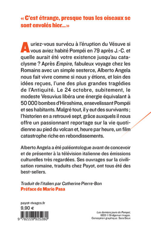 Tout à la fois archéologue et homme de télévision, l'Italien Alberto Angela reprend la formule du "docufiction sur papier", qui a fait le succès d'«Empire» (Payot, 2016), pour nous offrir un reportage au coeur du quotidien de Pompéi durant les deux jours ayant précédé le réveil du Vésuve, en 79 de notre ère, puis pour nous décrire la colère destructrice du volcan dans un film catastrophe qui durera l'équivalent d"une troisième journée. Un livre d'histoire qui brise bien des idées reçues à partir des dernières découvertes scientifiques (la catastrophe aurait eu lieu à l'automne et non en août), mais qui possède aussi un tel souffle romanesque qu'on se croirait embarqués à bord d'un «Titanic» de l'Antiquité.