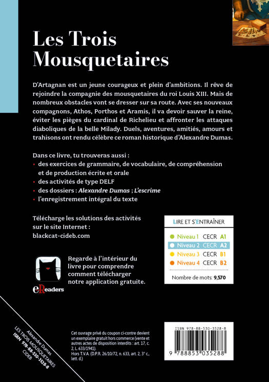 D’Artagnan est un jeune courageux et plein d’ambitions. Il rêve de rejoindre la compagnie des Mousquetaires du roi Louis XIII. Mais de nombreux obstacles vont se dresser sur sa route. Avec ses nouveaux compagnons, Athos, Porthos et Aramis, il va devoir sauver la reine, éviter les pièges du cardinal de Richelieu et affronter les attaques diaboliques de la belle Milady. Duels, aventures, amitiés, amours et trahisons ont rendu célèbre ce roman historique d’Alexandre Dumas. Niveau 2-A2.