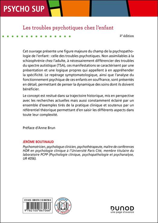 Cette 2èmeédition présente une figure majeure du champ de la psychopathologie de l’enfant : celle des troubles psychotiques. Non assimilables à la schizophrénie chez l’adulte, à nécessairement différencier des troubles du spectre autistique (TSA), ces manifestations se caractérisent par une présentation et une logique propres. Le repérage symptomatologique ainsi que l’analyse du fonctionnement psychique de ces enfants en souffrance sont ici présentés en détail, permettant de penser la dynamique des soins dont ils doivent bénéficier.