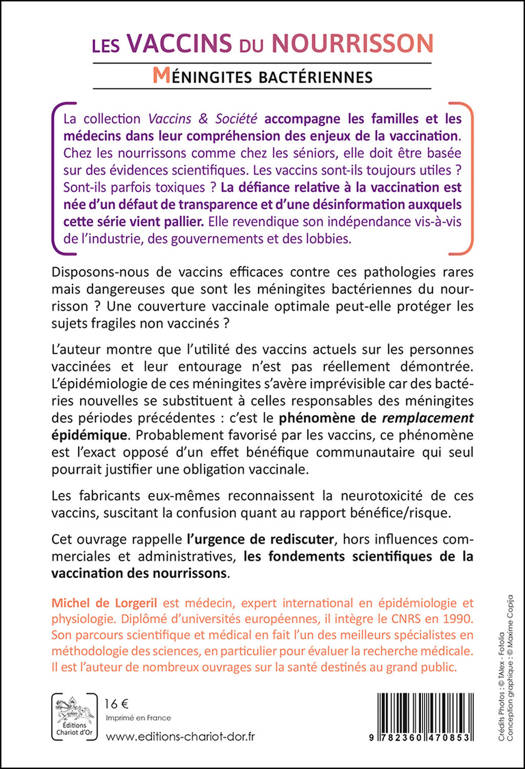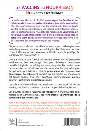 La collection « Vaccins & Société » accompagne les familles et les médecins dans leur compréhension des enjeux de la vaccination. Interrogeons-nous. Disposons-nous de vaccins efficaces contre ces pathologies rares mais dangereuses que sont les méningites bactériennes du nourrisson ? Une couverture vaccinale optimale peut-elle protéger les sujets fragiles non vaccinés ? L’auteur montre que l’utilité des vaccins actuels sur les individus vaccinés et leur entourage n’est pas démontrée, car des bactéries nouvelles se substituent à celles responsables des méningites des périodes précédentes : c’est le phénomène de remplacement épidémique. Probablement favorisé par les vaccins, ce phénomène est l’exact opposé d’un effet bénéfique communautaire qui seul pourrait justifier une obligation vaccinale. Les fabricants eux-mêmes reconnaissent la neurotoxicité de ces vaccins. Cet ouvrage rappelle l’urgence de rediscuter les fondements scientifiques de la vaccination des nourrissons.