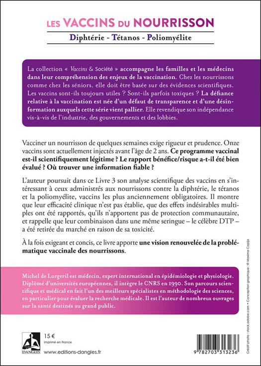 Vacciner un nourrisson de quelques semaines exige rigueur et prudence. Onze vaccins sont actuellement injectés avant l'âge de 2 ans. Ce programme vaccinal est-il scientifiquement légitime ? Le rapport bénéfice/risque a-t-il été bien évalué ? Où trouver une information fiable ? L'auteur poursuit dans ce Livre 3 son analyse scientifique des vaccins en s'intéressant à ceux administrés aux nourrissons contre la diphtérie, le tétanos et la poliomyélite, vaccins les plus anciennement obligatoires. Il montre que leur efficacité clinique n'est pas établie, que des effets indésirables multiples ont été rapportés, qu'ils n'apportent pas de protection communautaire, et rappelle que leur combinaison dans une même seringue - le célèbre DTP - a été retirée du marché en raison de sa toxicité.