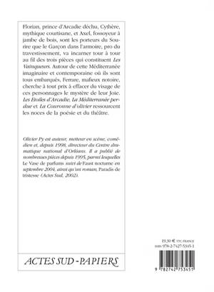 Florian, prince d'Arcadie déchu, Cythère, mythique courtisane, et Axel, fossoyeur à jambe de bois, sont les porteurs du Sourire que le Garçon dans l'armoire, pro du travestissement, va incarner tour à tour au fil des trois pièces qui constituent Les Vainqueurs. Autour de cette Méditerranée imaginaire et contemporaine où ils sont tous embarqués, Ferrare, mafieux notoire, cherche à tout prix à effacer du visage de ces personnages le mystère de leur Joie. Les Etoiles d'Arcadie, La Méditerranée perdue et La Couronne d'olivier ressourcent les noces de la poésie et du théâtre. «Olivier Py est auteur, metteur en scène, comédien et, depuis 1998, directeur du Centre dramatique national d'Orléans. Il a publié de nombreuses pièces depuis 1995, parmi lesquelles »Le Vase de parfums« suivi de »Faust nocturne« en septembre 2004, ainsi qu'un roman, »Paradis de tristesse« (Actes Sud, 2002).»