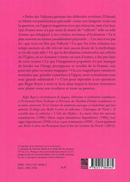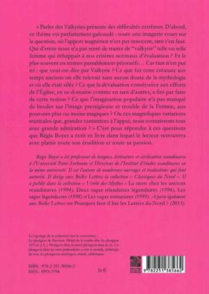 English summary: Regis Boyer presents an erudite and passionate discussion of Valkyries, from their mythical origins to the pejorative sense that the term often carries today, including Wagners conscious use of them on the operatic stage. French description: Parler des Valkyries presente des difficultes extremes. D'abord, ce theme est parfaitement galvaude: toute une imagerie court sur la question, ou l'apport wagnerien n'est pas innocent, tant s'en faut. Qui d'entre nous n'a pas tente de traiter de valkyrie telle ou telle femme qui echappait a nos criteres normaux d'evaluation ? Et le plus souvent en termes passablement pejoratifs... Car rien n'est pur ici: que veut-on dire par Valkyrie ? Ce que fut cette creature aux temps anciens ou elle relevait sans aucun doute de la mythologie et ou elle etait ailee ? Ce que la devaluation consecutive aux efforts de l'Eglise, en ce domaine comme en tant d'autres, a fini par faire de cette notion ? Ce que l'imagination populaire n'a pas manque de broder sur l'image prestigieuse et trouble de la Femme, aux pouvoirs plus ou moins magiques ? ou ces magnifiques variations musicales que, grandes cantatrices a l'appui, nous connaissons tous avec grande admiration ? C'est pour repondre a ces questions que Regis Boyer a ecrit ce livre dans lequel le lecteur retrouvera avec plaisir toute son erudition et toute sa passion.