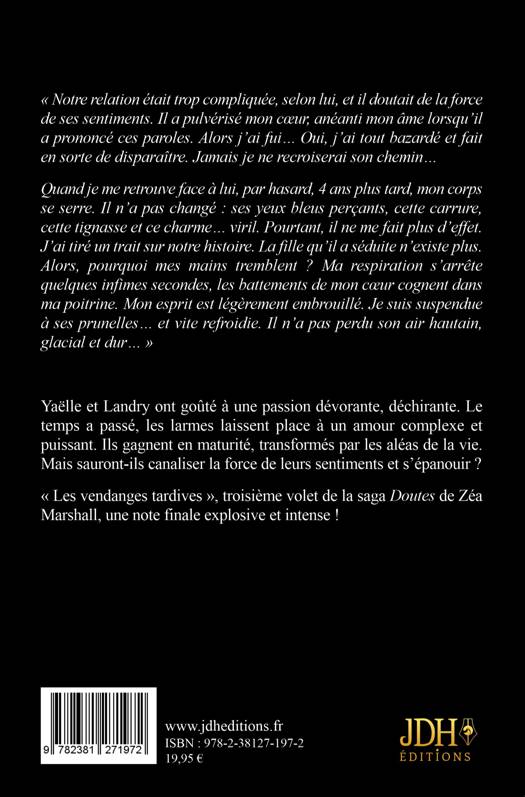 "Notre relation était trop compliquée, selon lui, et il doutait de la force de ses sentiments. Il a pulvérisé mon coeur, anéanti mon âme lorsqu'il a prononcé ces paroles. Alors j'ai fui... Oui, j'ai tout bazardé et fait en sorte de disparaître. Jamais je ne recroiserai son chemin... Quand je me retrouve face à lui, par hasard, 4 ans plus tard, mon corps se serre. Il n'a pas changé ses yeux bleus perçants, cette carrure, cette tignasse et ce charme... viril. Pourtant, il ne me fait plus d'effet. J'ai tiré un trait sur notre histoire. La fille qu'il a séduite n'existe plus. Alors, pourquoi mes mains tremblent ? Ma respiration s'arrête quelques infimes secondes, les battements de mon coeur cognent dans ma poitrine. Mon esprit est légèrement embrouillé. Je suis suspendue à ses prunelles... et vite refroidie. Il n'a pas perdu son air hautain, glacial et dur..." Yaëlle et Landry ont goûté à une passion dévorante, déchirante. Le temps a passé, les larmes laissent place à un amour complexe et puissant. Ils gagnent en maturité, transformés par les aléas de la vie. Mais sauront-ils canaliser la force de leurs sentiments et s'épanouir ? "Les vendanges tardives", troisième volet de la saga "Doutes" de Zéa Marshall, une note finale explosive et intense !
