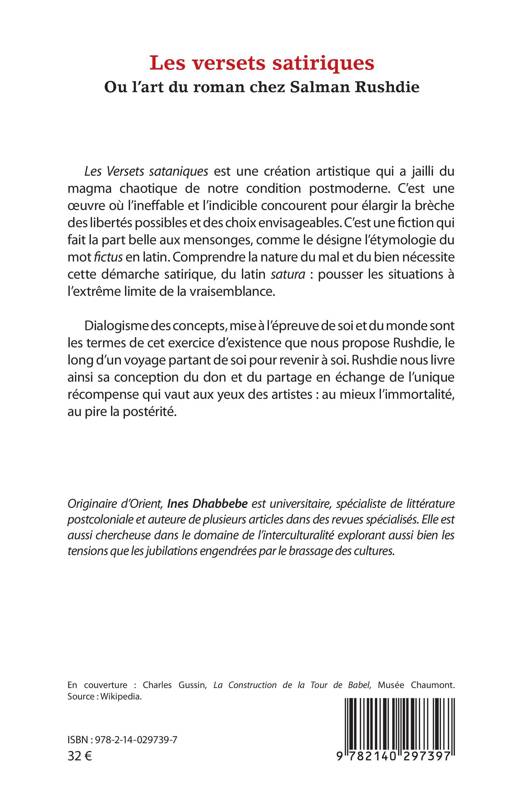 Les Versets sataniques est une création artistique qui a jailli du magma chaotique de notre condition postmoderne. C'est une oeuvre où l'ineffable et l'indicible concourent pour élargir la brèche des libertés possibles et des choix envisageables. C'est une fiction qui fait la part belle aux mensonges, comme le désigne l'étymologie du mot fictus en latin. Comprendre la nature du mal et du bien nécessite cette démarche satirique, du latin satura: pousser les situations à l'extrême limite de la vraisemblance. Dialogisme des concepts, mise à l'épreuve de soi et du monde sont les termes de cet exercice d'existence que nous propose Rushdie, le long d'un voyage partant de soi pour revenir à soi. Rushdie nous livre ainsi sa conception du don et du partage en échange de l'unique récompense qui vaut aux yeux des artistes: au mieux l'immortalité, au pire la postérité.