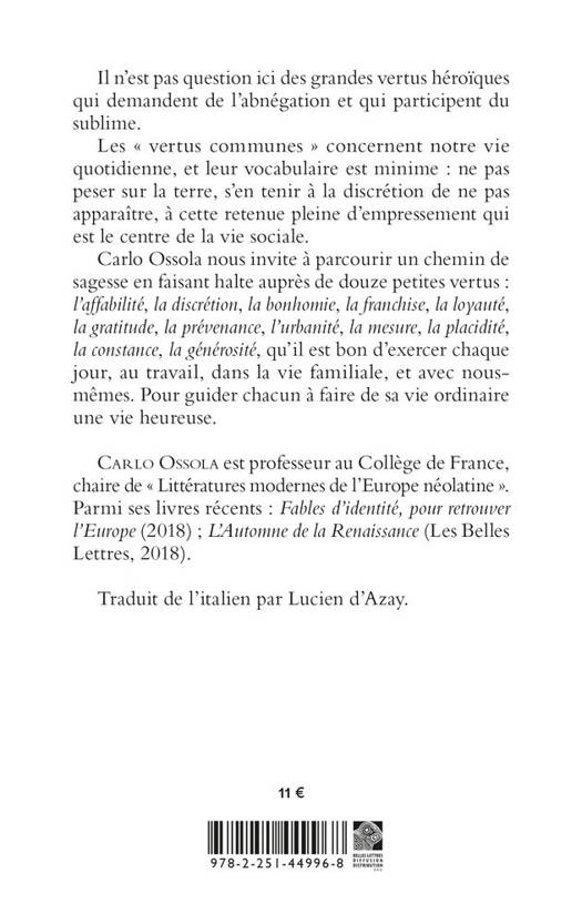 Il n’est pas question ici des grandes vertus héroïques qui demandent de l’abnégation et qui participent du sublime. Les « vertus communes » concernent notre vie quotidienne, et leur vocabulaire est minime : ne pas peser sur la terre, s’en tenir à la discrétion de ne pas apparaître, à cette retenue pleine d’empressement qui est le centre de la vie sociale. Carlo Ossola nous invite à parcourir un chemin de sagesse en faisant halte auprès de douze petites vertus : l’affabilité, la discrétion, la bonhomie, la franchise, la loyauté, la gratitude, la prévenance, l’urbanité, la mesure, la placidité, la constance, la générosité, qu’il est bon d’exercer chaque jour, au travail, dans la vie familiale, et avec nous-mêmes. Pour guider chacun à faire de sa vie ordinaire une vie heureuse.