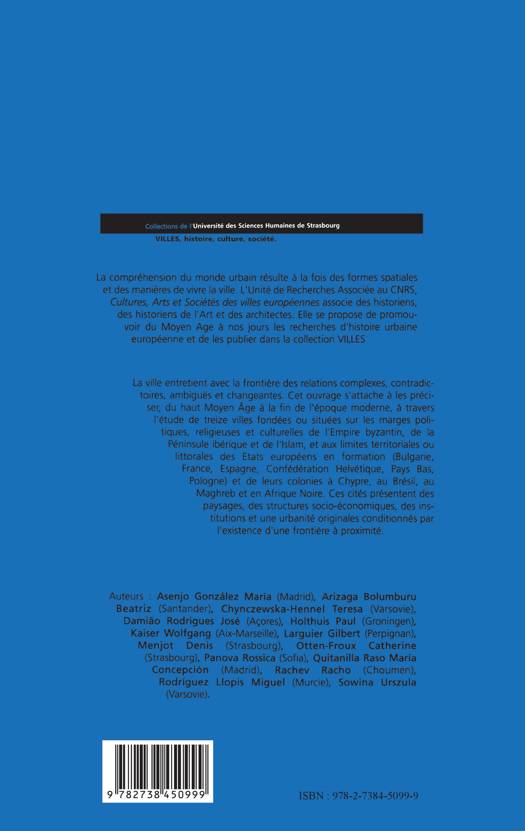 La ville entretient avec la frontière des relations complexes, contradictoires, ambiguës et changeantes. Cet ouvrage s'attache à les préciser, du haut Moyen Age à la fin de l'époque moderne, à travers l'étude de treize villes fondées ou situées sur les marges politiques, religieuses et culturelles de l'Empire byzantin, de la Péninsule ibérique et de l'Islam, et aux limites territoriales ou littorales des Etats européens en formation (Bulgarie, France, Espagne, Confédération Helvétique, Pays Bas, Pologne) et de leurs colonies à Chypre, au Brésil, au Maghreb et en Afrique Noire. Ces cités présentent des paysages, des structures socio-économiques, des institutions et une urbanité originales conditionnés par l'existence d'une frontière à proximité.