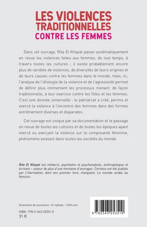 Dans cet ouvrage, Rita El Khayat passe systématiquement en revue les violences faites aux femmes, de tout temps, à travers toutes les cultures ; il existe probablement encore plus de variétés de violences, de diversités de leurs origines et de leurs causes contre les femmes dans le monde, mais, ici, l'analyse de l'étiologie de la violence et de l'agressivité permet de définir plus intimement les processus menant, de façon traditionnelle, à leur exercice contre les filles et les femmes. C'est une donnée universelle : le patriarcat a créé, permis et exercé la violence à l'encontre des femmes dans des formes extrêmement diverses et disparates. Cet ouvrage est unique par sa documentation et le passage en revue de toutes les cultures et de toutes les époques ayant exercé ou exerçant la violence sur la composante féminine, phénomène existant dans toutes les sociétés du monde.