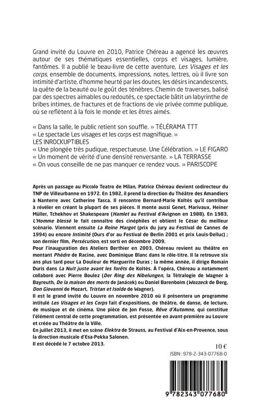 Grand invité du Louvre en 2010, Patrice Chéreau a agencé les oeuvres autour de ses thématiques essentielles, corps et visages, lumière, fantômes. il a publié le beau-livre de cette aventure, Les visages et les corps, ensemble de documents, impressions, notes, lettres, où il livre son intimité d'artiste, d'homme heurté par les doutes, les désirs incandescents, la quête de la beauté ou le goût des ténèbres. Cette version est adaptée pour le théâtre par Philippe Calvario.