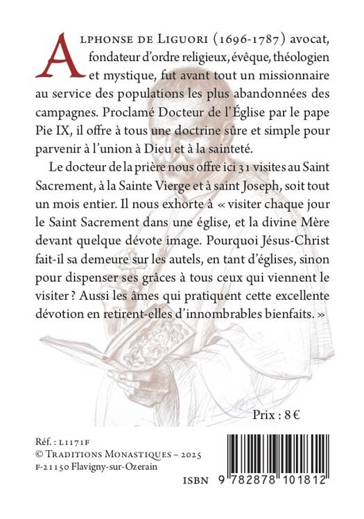 Le docteur de la prière nous offre ici 31 visites au Saint Sacrement, à la Sainte Vierge et à saint Joseph, soit tout un mois entier. Il nous exhorte à « visiter chaque jour le Saint Sacrement dans une église, et la divine Mère devant quelque dévote image. Pourquoi Jésus-Christ fait-il sa demeure sur les autels, en tant d’églises, sinon pour dispenser ses grâces à tous ceux qui viennent le visiter ? Aussi les âmes qui pratiquent cette excellente dévotion en retirent-elles d’innombrables bienfaits. »