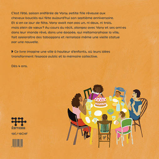 C’est l’été, saison préférée de Vany, petite fille rêveuse aux cheveux bouclés qui fête aujourd’hui son septième anniversaire. Et si, en ce jour de fête, Vany avait non pas un, ni deux, ni trois, mais plein de vœux ? Au cours du récit, plongez avec Vany et ses ami·es dans leur monde rêvé, dans une épopée qui métamorphose la ville, fait apparaître des toboggans et remplace même une vieille statue par une nouvelle.