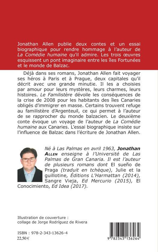 Jonathan Allen publie deux contes et un essai biographique pour rendre hommage à l'auteur de La Comédie humaine qu'il admire. Les trois oeuvres esquissent un pont imaginaire entre les îles Fortunées et le monde de Balzac par exemple son conte Le Familistère dévoile les conséquences de la crise de 2008 pour les habitants des îles Canaries obligés d'immigrer en masse. Certains trouvent refuge au familistère d'Argenteuil, ce qui permet à l'auteur de se rapprocher du monde balzacien.