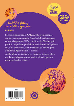 Le jour de sa rentrée en CM2, Aretha n'en croit pas ses yeux : dans sa nouvelle école, les filles et les garçons ne se mélangent pas ! D'un côté il y a les Machos qui, paraît-il, ne parlent que de foot, et de l'autre les Pipelettes qui, c'est bien connu, ne s'intéressent qu'aux poupées à paillettes. Quels horribles clichés ! Aretha a bien envie d'envoyer valser ces préjugés idiots une bonne fois pour toutes, mais le clan des garçons, mené par Merlin, résiste...