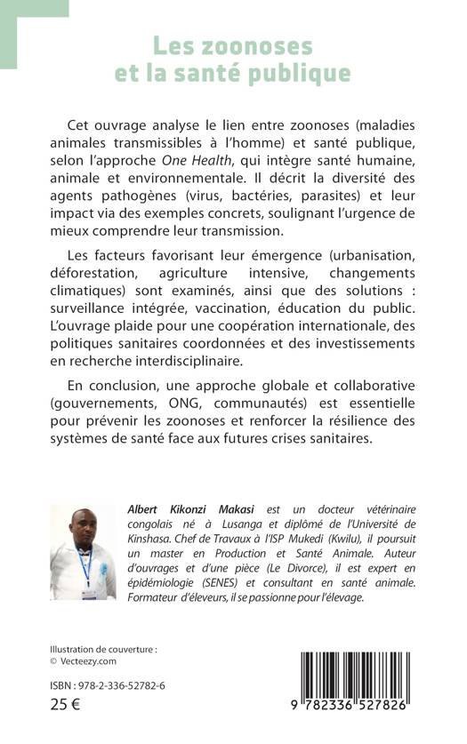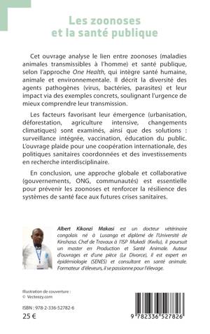 Cet ouvrage analyse le lien entre zoonoses (maladies animales transmissibles à l'homme) et santé publique, selon l'approche One Health, qui intègre santé humaine, animale et environnementale. Il décrit la diversité des agents pathogènes (virus, bactéries, parasites) et leur impact via des exemples concrets, soulignant l'urgence de mieux comprendre leur transmission. Les facteurs favorisant leur émergence (urbanisation, déforestation, agriculture intensive, changements climatiques) sont examinés, ainsi que des solutions: surveillance intégrée, vaccination, éducation du public. L'ouvrage plaide pour une coopération internationale, des politiques sanitaires coordonnées et des investissements en recherche interdisciplinaire. En conclusion, une approche globale et collaborative (gouvernements, ONG, communautés) est essentielle pour prévenir les zoonoses et renforcer la résilience des systèmes de santé face aux futures crises sanitaires.