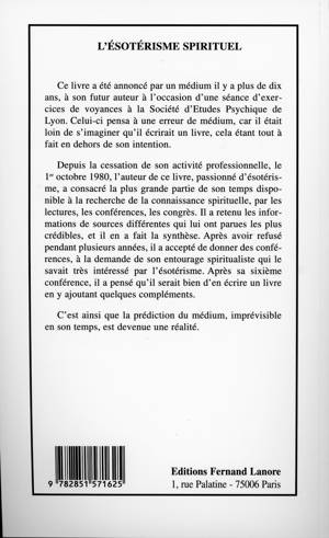 Ce livre a été annoncé par un médium il y a plus de dix ans, à son futur auteur à l’occasion d’une séance d’exercices de voyances à la Société d’Etudes Psychique de Lyon. Celui-ci pensa à une erreur de médium, car il était loin de s’imaginer qu’il écrirait un livre, cela étant tout à fait en dehors de son intention. Depuis la cessation de son activité professionnelle, le 1er octobre 1980, l’auteur de ce livre, passionné d’ésotérisme, a consacré la plus grande partie de son temps disponible à la recherche de la connaissance spirituelle, par les lectures, les conférences, les congrès. Il a retenu les informations de sources différentes qui lui ont parues les plus crédibles, et il en a fait la synthèse. Après avoir refusé pendant plusieurs années, il a accepté de donner des conférences, à la demande de son entourage spiritualiste qui le savait très intéressé par l’ésotérisme. Après sa sixième conférence, il a pensé qu’il serait bien d’en écrire un livre en y ajoutant quelques compléments. C’est ainsi que la prédiction du médium, imprévisible en son temps, est devenue dune réalité.