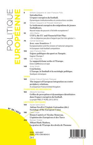 Au sommaire de ce numéro : Le traitement européen des migrations de jeunes footballeurs / UEFA, the EU and Financial Fair Play / Jeux sans frontières / Enjeux politiques du sport en Turquie / Le supportérisme serbe et l'Europe / L'Europe, le football et la sociologie politique.