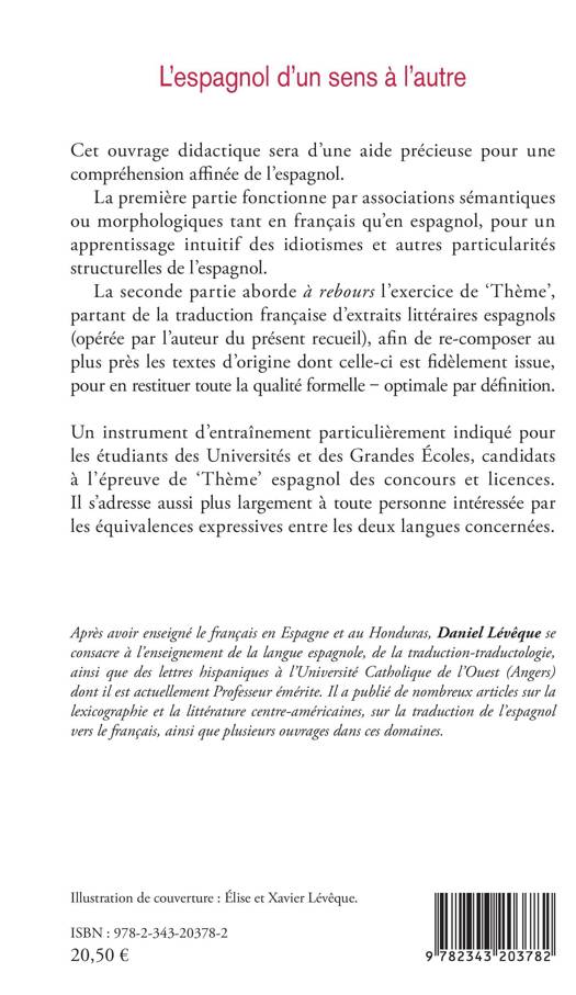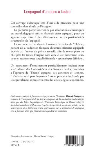 Cet ouvrage didactique sera d'une aide précieuse pour une compréhension affinée de l'espagnol. La première partie fonctionne par associations sémantiques ou morphologiques tant en français qu'en espagnol, pour un apprentissage intuitif des idiotismes et autres particularités structurelles de l'espagnol. La seconde partie aborde à rebours l'exercice de 'Thème', partant de la traduction française d'extraits littéraires espagnols afin de re-composer au plus près les textes d'origine dont celle-ci est fidèlement issue.