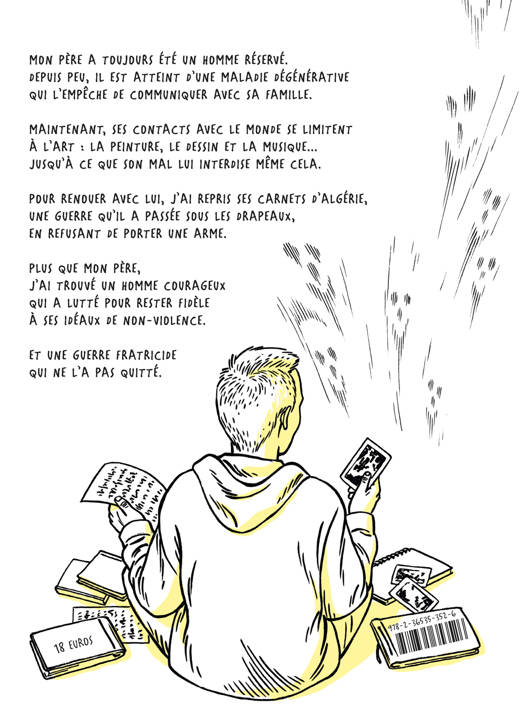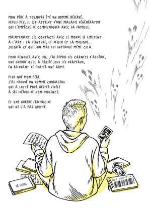 Une bande-dessinée hommage, où la mémoire de guerre se mêle à celle des proches, quand tout s'efface. Mon père a toujours été un homme réservé. Depuis peu, il est atteint d'une maladie dégénérative qui l'empêche de communiquer avec sa famille. Ses contacts avec le monde se limitent alors peu à peu à l'Art : la peinture, le dessin et la musique. Jusqu'à ce que son mal lui interdise même cela. Pour renouer avec lui, j'ai repris ses carnets d'Algérie, une guerre qu'il a passée sous les drapeaux, en refusant de porter une arme. Plus que mon père, j'ai trouvé un homme courageux qui a lutté pour rester fidèle à ses idéaux de non-violence. Et une guerre fratricide qui ne l'a jamais quitté.