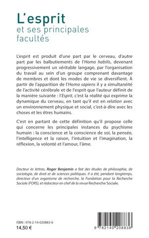 L’esprit est produit d’une part par le cerveau, d’autre part par les balbutiements de l’Homo habilis, devenant progressivement un véritable langage, par l’organisation du travail au sein d’un groupe comprenant davantage de membres et dont les modes de vie se diversifient. À partir de l’apparition de l’Homo sapiens il y a simultanéité de l’activité cérébrale et de l’esprit que l’auteur définit de la manière suivante : l’Esprit, c’est la réalité qui exprime la dynamique du cerveau, en tant qu’il est en relation avec un environnement physique et social, c’est-à-dire avec les choses et les êtres humains. C’est en partant de cette définition qu’il propose celle qui concerne les principales instances du psychisme humain : la conscience et la conscience de soi, la pensée, l’intelligence et la raison, l’intuition et l’imagination, la réflexion, la volonté et l’amour, l’âme.
