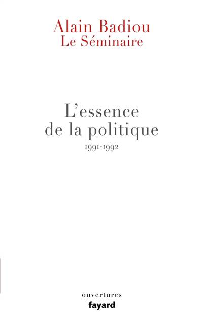 « Le séminaire “L’essence de la politique” appartient au cycle qui étudie les quatre procédures de vérité (science, art, amour, politique) dans leur être de condition de la philosophie. Le cœur de l’entreprise a cette fois été de démontrer un théorème spéculatif difficile, dont je donne, près de trente ans plus tard, une version synthétique : La politique est la pensée, ou la théorie, de ce qu’elle est, y compris si on l’entend comme “pratique”, comme action transformatrice de l’humanité par elle-même. Mais une définition de la politique, qui en expose l’Idée éternelle, est toujours de nature philosophique. Il en résulte que toute confusion entre la pensée politique comme telle, agissant en situation, et sa définition philosophique, tournée vers l’éternité, prépare un désastre. Ces pages confrontent en moi-même, et dans leur tension toujours portée à l’irrésolution, le militant et le philosophe. Que le lecteur injecte dans ce support ses propres impasses… »