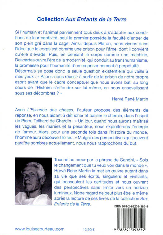 Si l’humain et l’animal parviennent tous deux à s’adapter aux conditions de leur captivité, seul le premier possède la faculté d’entrer de son plein gré dans la cage. Ainsi, depuis Platon, nous vivons dans l’idée que le corps est comme une prison pour l'âme, dont il convient qu’elle s’évade. Puis, en pensant le corps comme une machine, Descartes ouvre l’ère de la modernité, qui conduit au transhumanisme, la promesse pour l’humanité d’un emprisonnement à perpétuité. Désormais se pose donc la seule question existentielle qui vaille à mes yeux : « Allons-nous réussir à sortir de la prison de notre propre esprit avant que le cadre conceptuel que nous avons bâti au long cours de l’Histoire s’effondre sur lui-même, en nous ensevelissant sous ses décombres ? » Hervé René Martin. Avec « L'Essence des choses », l’auteur nous aide à défricher et baliser le chemin.