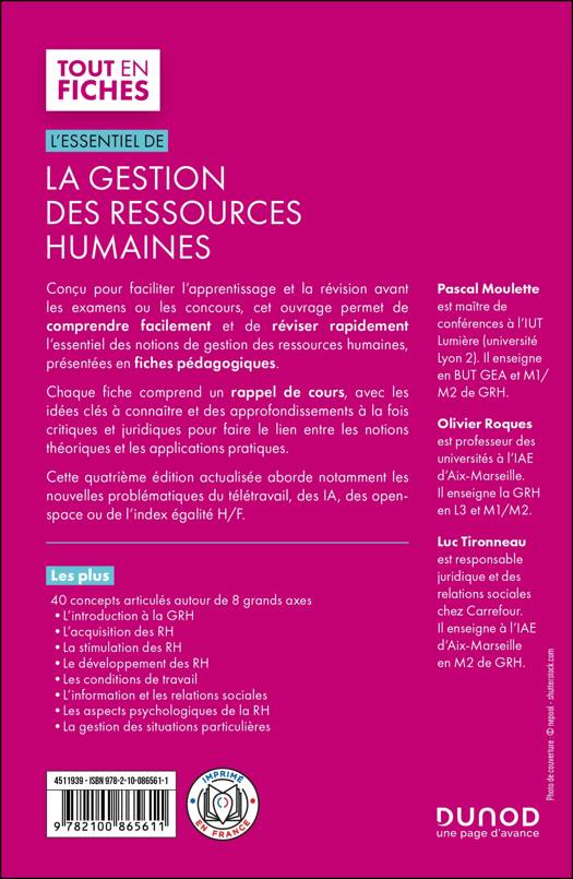 Conçu pour faciliter l’apprentissage et la révision avant les examens ou les concours, cet ouvrage permet de comprendre facilement et de réviser rapidement l’essentiel des notions de gestion des ressources humaines, présentées en fiches pédagogiques. Chaque fiche comprend un rappel de cours, avec les idées clés à connaître et des approfondissements à la fois critiques et juridiques pour faire le lien entre les notions théoriques et les applications pratiques. Cette quatrième édition actualisée aborde notamment les nouvelles problématiques du télétravail, des IA, des openspace ou de l’index égalité H/F.