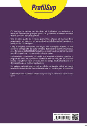 - Une première partie de révisions permettra à chacun de se réapproprier les bases, et un appendix récapitule les verbes irréguliers et les symboles phonétiques.