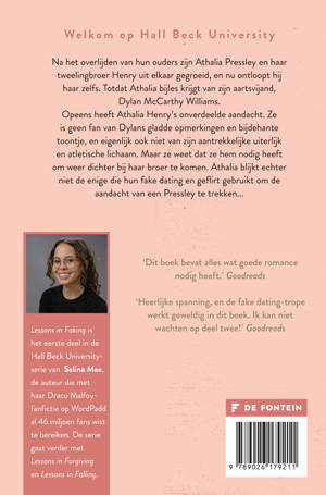 Sinds de dood van hun ouders zijn de tweeling Athalia en Henry Pressley uit elkaar gegroeid. Athalia mist hun oude vertrouwde band, maar Henry ontloopt haar inmiddels – totdat zij bijles gaat volgen bij zijn aartsvijand, Dylan McCarthy Williams. Opeens heeft Athalia Henry’s onverdeelde aandacht, maar als ze dat zo wil houden heeft ze Dylans hulp nodig. Hoewel ze geen fan is van Dylans gladde opmerkingen en bijdehante toontje, weet ze dat ze moet doorzetten om weer dichter bij haar broer te komen. Athalia en Dylans toneelspel van gemaakte vrolijkheid en fake dating dient namelijk één gemeenschappelijk doel: de aandacht trekken van een Pressley… ‘Lessons in Faking’ is het eerste deel in de Hall Beck University-serie van Selina Mae, de auteur die met haar Draco Malfoy-fanfictie op WordPadd al 40 miljoen fans wist te bereiken. De serie gaat verder met ‘Lessons in Forgiving’ en 'Lessons in Falling'. Dit is de Nederlandstalige uitgave.