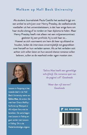 ‘Lessons in Forgiving’ is het eerste deel in de Hall Beck University-serie van Selina Mae, de auteur die met haar Draco Malfoy-fanfictie op WordPadd al 40 miljoen fans wist te bereiken. De serie begint met ‘Lessons in Faking’ en gaat verder in 'Lessons in Falling'. Dit is de Nederlandstalige editie.
