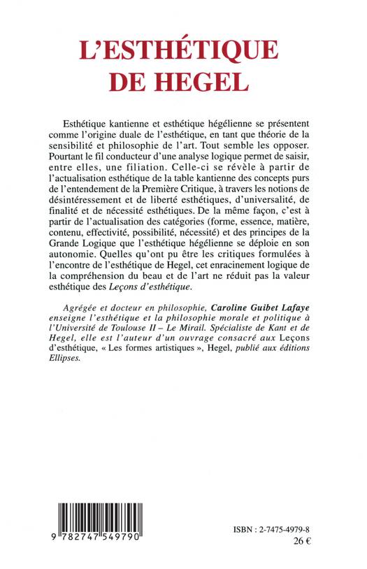 Esthétique kantienne et esthétique hégélienne se présentent comme l'origine duale de l'esthétique, en tant que théorie de la sensibilité et philosophie de l'art. Tout semble les opposer. Pourtant le fil conducteur d'une analyse logique permet de saisir entre elles, une filiation. Celle-ci se révèle à partir de l'actualisation esthétique de la table kantienne des concepts purs de l'entendement de la Première Critique . De la même façon, c'est à partir de l'actualisation des catégories (formes, essence, matière, contenu, effectivité, possibilité, nécessité) et des principe de la Grande Logique que l'esthétique hégelienne se déploie en son autonomie.