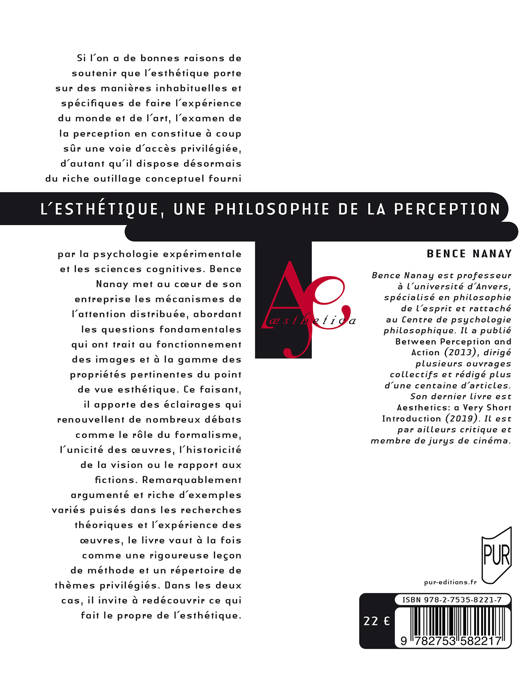 L'examen de la perception dispose désormais du riche outillage conceptuel fourni par la psychologie expérimentale et les sciences cognitives. Bence Nanay met au coeur de son entreprise les mécanismes de l'attention distribuée, abordant les questions fondamentales qui ont trait au fonctionnement des images et à la gamme des propriétés pertinentes du point de vue esthétique. Ce faisant, il apporte des éclairages qui renouvellent de nombreux débats comme le rôle du formalisme, l'unicité des oeuvres, l'historicité de la vision ou le rapport aux fictions. Remarquablement argumenté et riche d'exemples variés puisés dans les recherches théoriques et l'expérience des oeuvres, le livre vaut à la fois comme une rigoureuse leçon de méthode et un répertoire de thèmes privilégiés. Dans les deux cas, il invite à redécouvrir ce qui fait le propre de l'esthétique.