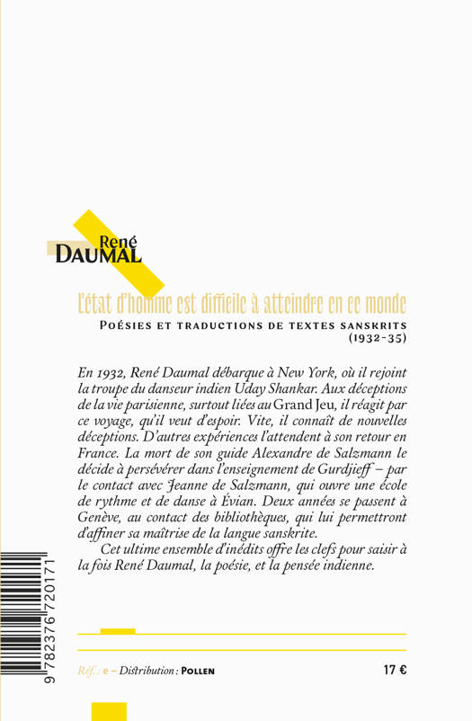En 1932, René Daumal débarque à New York, où il rejoint la troupe du danseur indien Uday Shankar. Aux déceptions de la vie parisienne, surtout liées au Grand Jeu, il réagit par ce voyage, qu'il veut d'espoir. Vite, il connaît de nouvelles déceptions. D'autres expériences l'attendent à son retour en France. La mort de son guide Alexandre de Salzmann le décide à persévérer dans l'enseignement de Gurdjieff – par le contact avec Jeanne de Salzmann, qui ouvre une école de rythme et de danse à Évian. Deux années se passent à Genève, au contact des bibliothèques, qui lui permettront d'affiner sa maîtrise de la langue sanskrite. Cet ultime ensemble d'inédits offre les clefs pour saisir à la fois René Daumal, la poésie, et la pensée indienne.